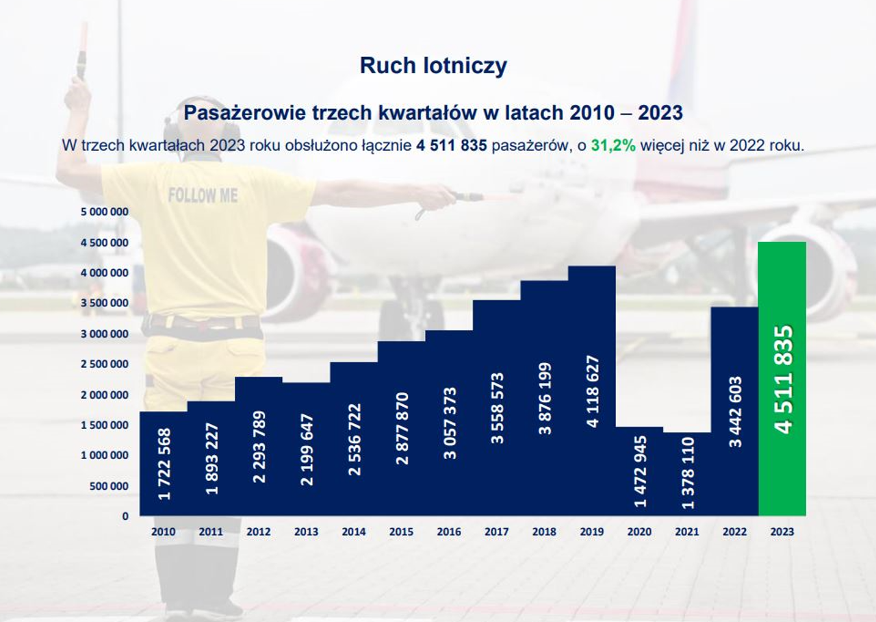 W ciągu trzech kwartałów 2023 roku Port Lotniczy Gdańsk odwiedziło 4 511 835 pasażerów. To o 31,1% więcej niż w 2022 roku i o 9,5 % więcej niż w 2019 roku, który był rekordowy dla gdańskiego lotniska. Było wówczas 5,4 mln pasażerów w skali całego roku.