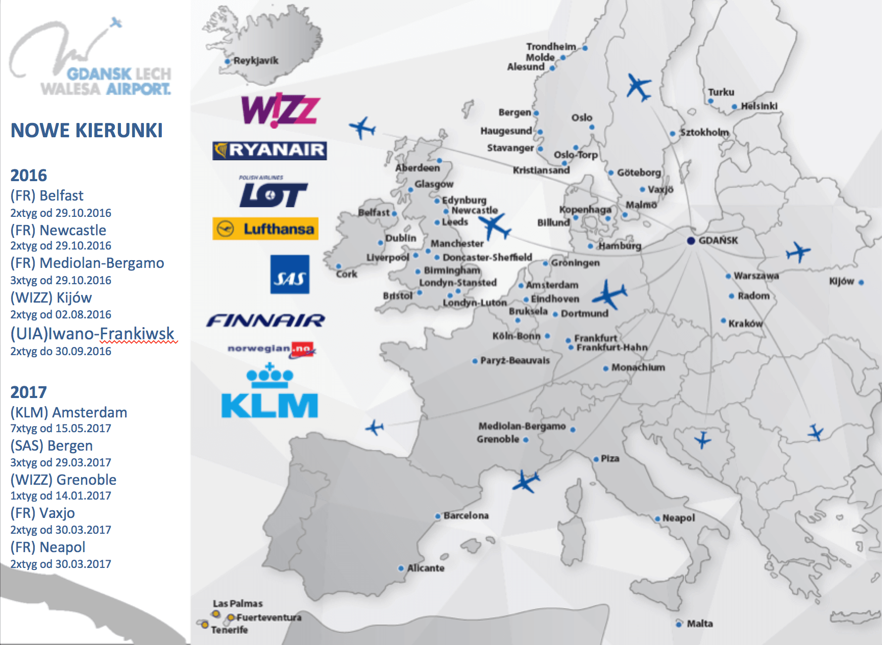Rok 2016 był kolejnym rokiem, w którym oprócz wzrostu liczby obsługiwanych pasażerów i rozwoju infrastruktury lotniskowej, Port Lotniczy Gdańsk po raz kolejny rozbudował swoją siatkę połączeń. Również w 2017 roku siatka lotów bezpośrednich z Gdańska wzbogaci się o kolejne połączenia do:
