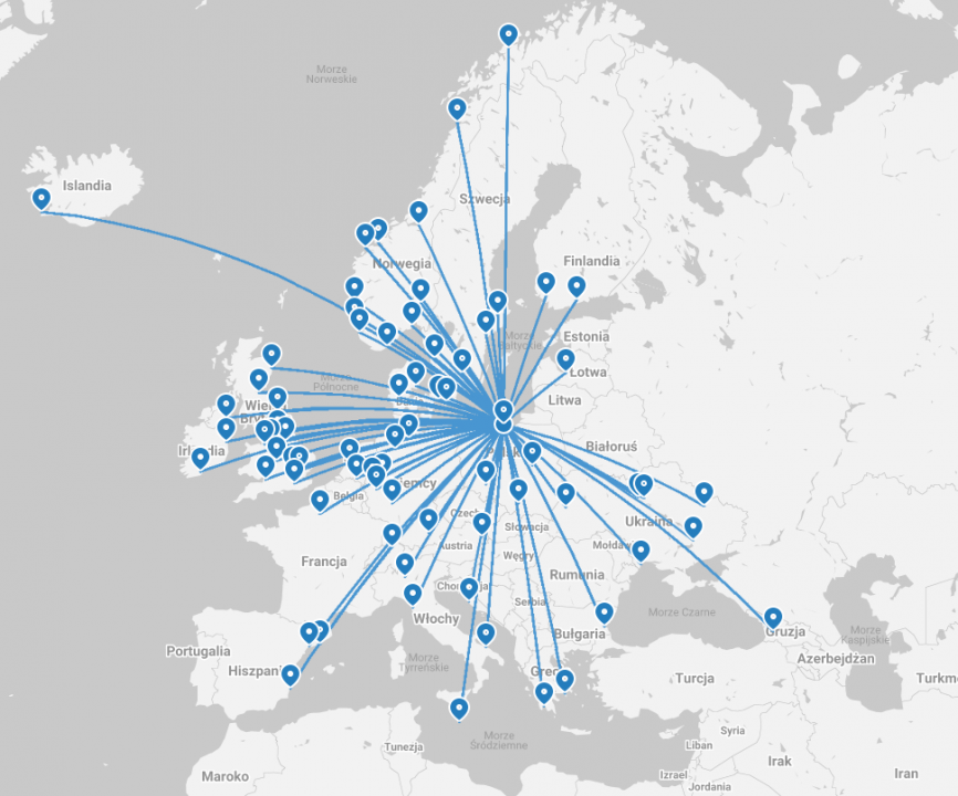 Billund, Aberdeen, Doncaster–Sheffield, Edynburg, Liverpool, Londyn-Gatwick, Londyn-Luton, Barcelona-El Prat, Paryż-Beauvais, Kutaisi, Eindhoven, Rejkiawik-Keflavik, Brema, Dortmund, Hamburg, Kolonia-Bonn, Alesund, Bergen, Bodo, Haugesund, Kristiansand, Molde, Oslo-Gardermoen, Oslo-Torp, Stavanger, Tromso, Trondheim, Goteborg, Malmo, Sztokholm–Skavsta,  Turku, Charków, Kijów, Lwów, Odessa, Zaporoże, Bari, Mediolan-Bergamo, Wiedeń (Wizz Air);