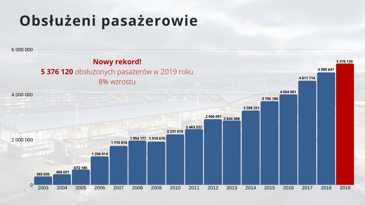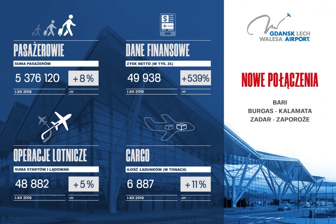 W grudniu 2019 Port Lotniczy Gdańsk świętował wizytę 5 milionowego pasażera. Dziś wiadomo, że w całym 2019 roku było w sumie 5.376.120 pasażerów przylatujących i odlatujących z Gdańska.
