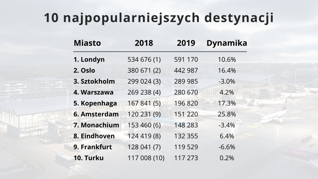 W 2019 roku pasażerowie zyskali nowe ciekawe połączenia realizowane przez nowych przewoźników. Wiosną wystartowały loty z Gdańska do Zurychu realizowane przez linie lotnicze SWISS, a jesienią do Dusseldorfu z Eurowings. Najpopularniejszym kierunkiem podróży w 2019 roku z Portu Lotniczego Gdańsk był Londyn.