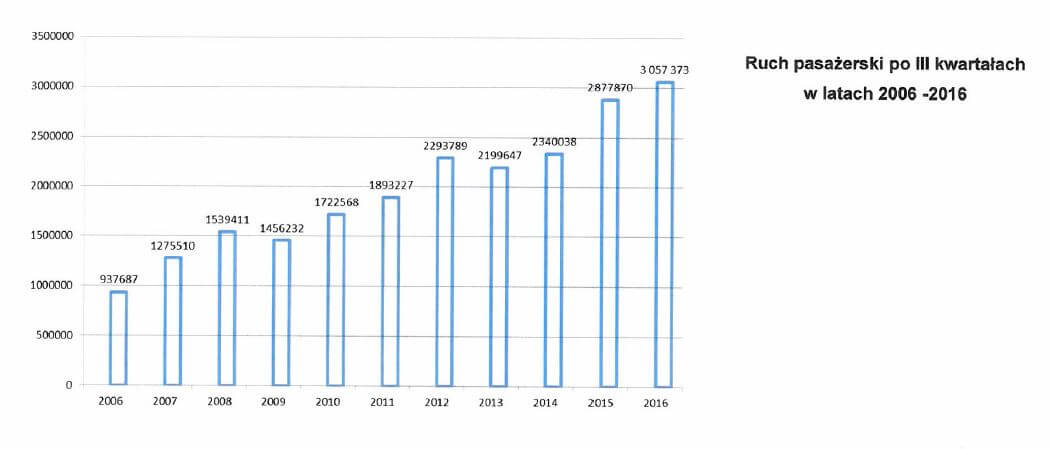 W okresie od stycznia do września 2016 roku włącznie, Port Lotniczy Gdańsk obsłużył 3 057 373 pasażerów. To wzrost o 6,2% w porównaniu do analogicznego okresu w 2015 roku.