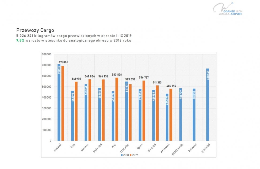 Po trzech kwartałach 2019 Port Lotniczy Gdańsk zanotował wzrost obsługiwanych towarów o 9,8 %.