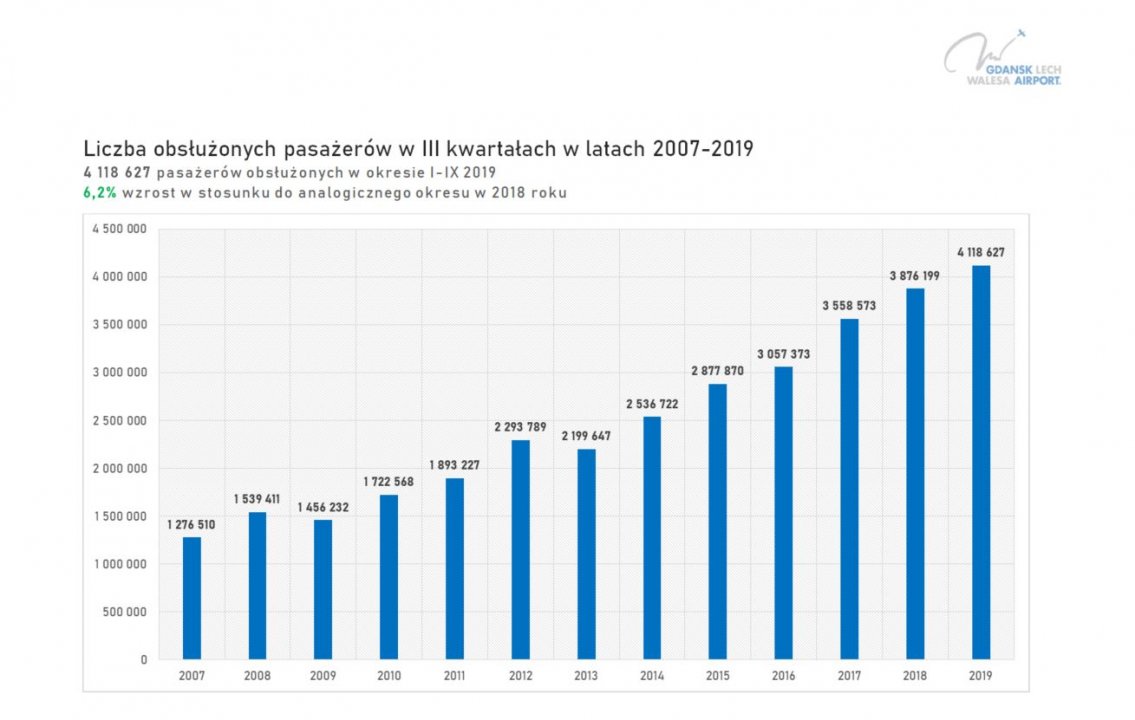 W ciągu 9 miesięcy tego roku Port Lotniczy Gdańsk obsłużył ponad 4 miliony pasażerów. Zrobiliśmy kolejny, ważny krok do osiągnięcia wyniku 5 milionów podróżnych w 2019. W ubiegłym roku, o tej samej porze mieliśmy ponad 240 tysięcy mniej pasażerów. Po trzech kwartałach 2019 roku mamy 4.118.627 podróżnych, w 2018 roku było ich 3.876.199. To wzrost o ponad 6 procent.