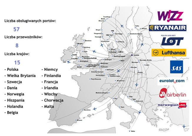 Aktualnie, w ruchu regularnym, z Gdańska polecieć można do 57 lotnisk zlokalizowanych w 15 krajach.