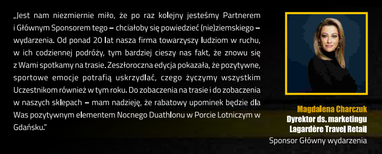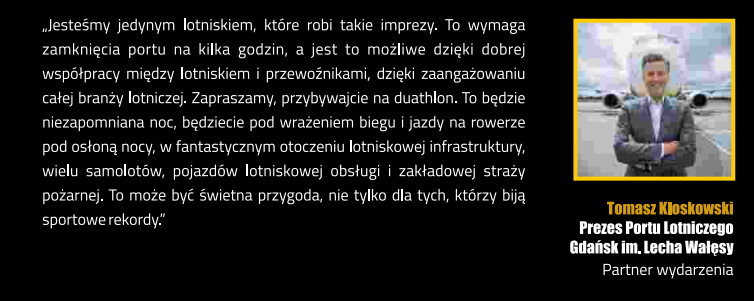 Zawody zostaną podzielone na trzy części. Duathloniści najpierw pobiegną pięć kilometrów, potem pojadą piętnaście kilometrów na rowerach i zakończą rywalizację biegiem na dystansie dwóch i pół kilometra. Wszystko nocą po drogach startowej i kołowania gdańskiego lotniska, wśród samolotów i całej lotniczej infrastruktury. Emocje gwarantowane.