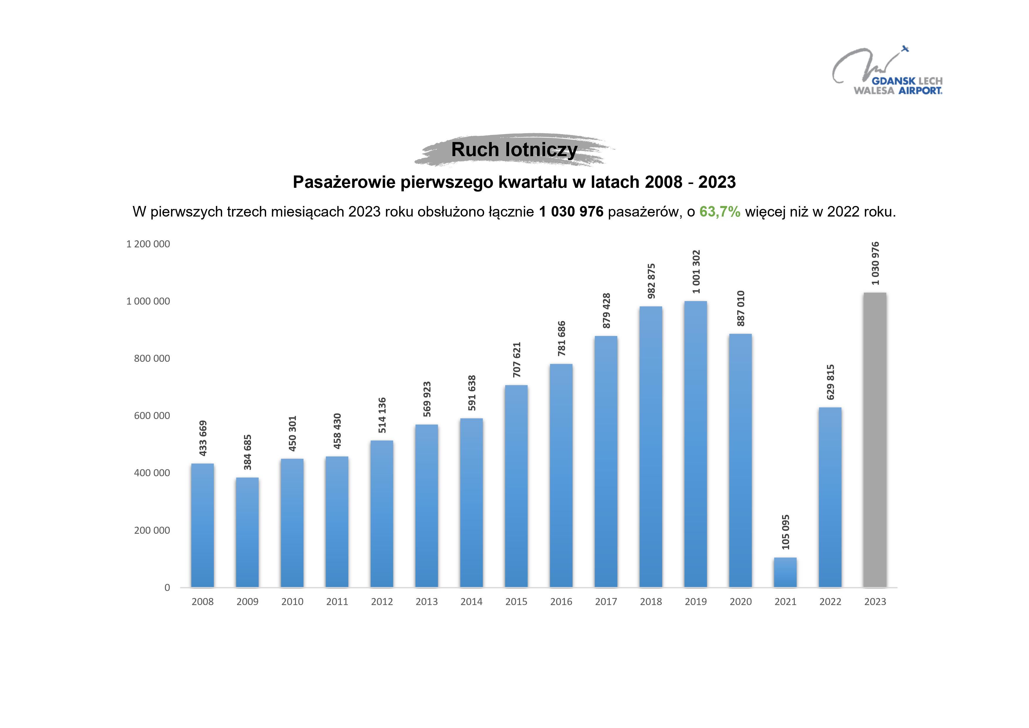 Od stycznia do marca 2023 Port Lotniczy Gdańsk obsłużył 1 030 976 pasażerów. Było ich aż o 63,7% więcej niż w porównywalnym okresie ubiegłego roku i o 3% więcej niż w rekordowym roku 2019. Władze lotniska wciąż liczą na pobicie rekordu sprzed pandemii, czyli przekroczenie 5,4 mln gości do końca 2023 roku.