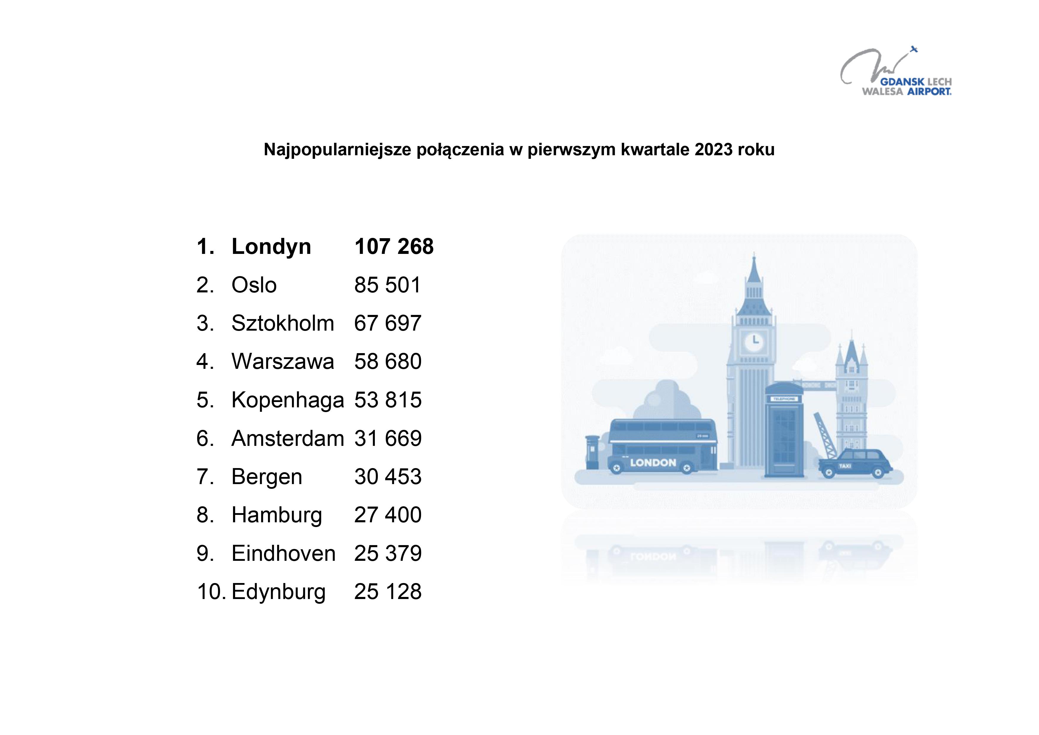 Najpopularniejsze połączenia z Gdańska były realizowane do Londynu (107 268 pasażerów), Oslo (85 501) i Sztokholmu (67 697).