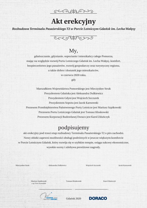 W akcie erekcyjnym napisano, że rozbudowa Terminalu Pasażerskiego T2 ma na względzie rozwój Portu Lotniczego Gdańsk im. Lecha Wałęsy, komfort, bezpieczeństwo jego pasażerów, rozwój gospodarczy oraz turystyczny regionu, a także dobro i dostatek jego mieszkańców.