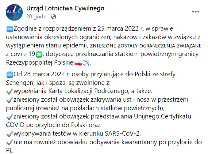 Od 28 marca przylatujący do Polski nie są kierowani na kwarantannę w związku ze stanem epidemii koronawirusa. Bez względu na to, czy podróżni są czy nie są zaszczepieni, czy są ozdrowieńcami i czy mają lub nie mają Unijnego Certyfikatu Covid-19, nie podlegają już obowiązkowej kwarantannie. Straż Graniczna nie sprawdza, czy pasażerowie mają negatywne wyniki testów na Covid, co w praktyce oznacza, że nie są one wymagane. Liberalne zaasady wjazdu do Polski dotyczą zarówno podróżujących z krajów Unii Europejskiej i należących do strefy Schengen, jak i spoza tych państw.