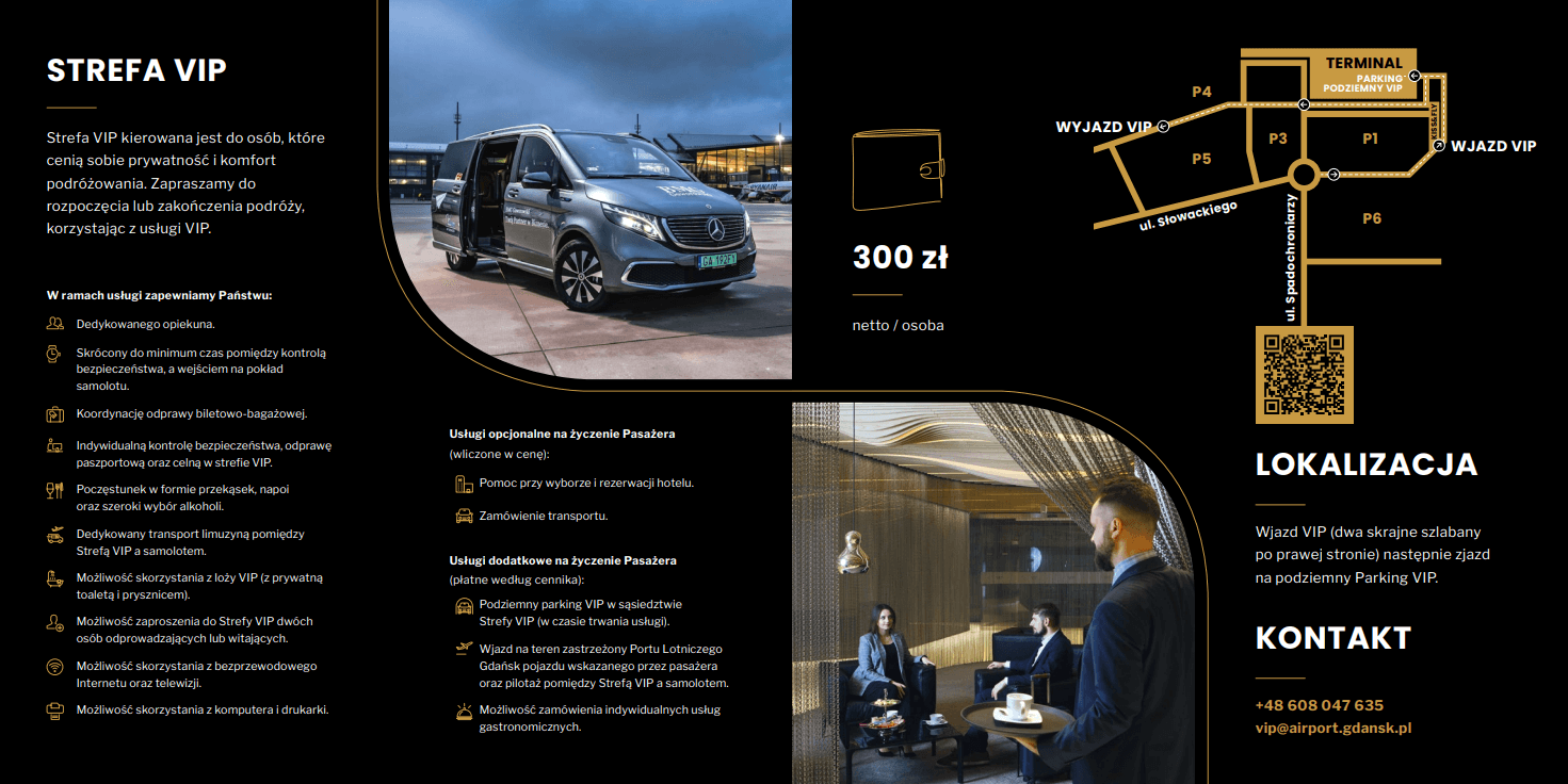 Zachęcamy także do skorzystania z lotniskowego salonu VIP. Pasażerowie w komfortowych warunkach i z zachowaniem prywatności mogą w nim oczekiwać na lot, mogą zaparkować swój samochód na specjalnym parkingu, a do samolotu zostaną zawiezieni limuzyną. Mogą być żegnani i witani przez rodzinę i przyjaciół, mogą tam też odbyć spotkanie biznesowe. Usługa VIP zostanie dopasowana do wymagań każdego pasażera. Szczegóły TUTAJ