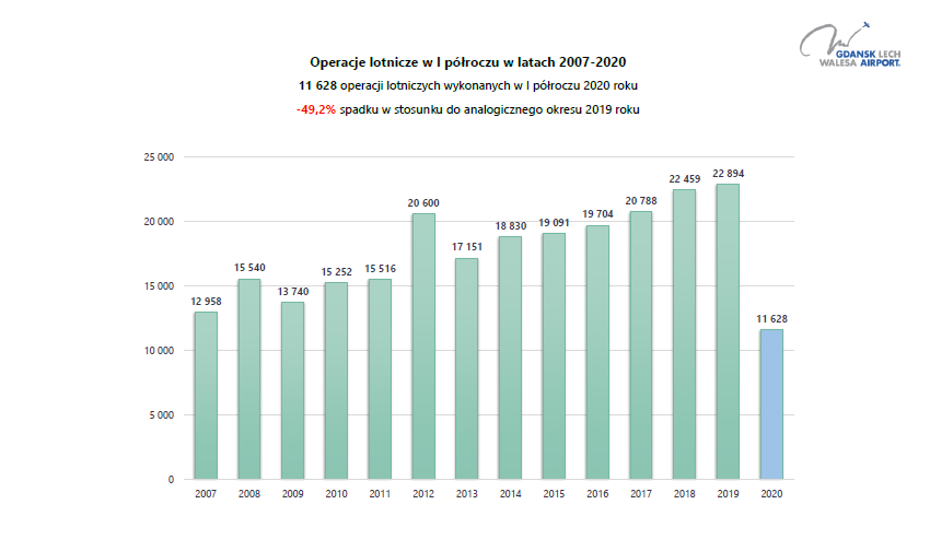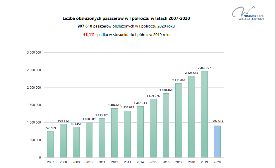 W ciągu sześciu miesięcy br. Port Lotniczy Gdańsk obsłużył 907 618 pasażerów. To mniej o 63,1% niż w porównywalnym, rekordowym okresie ubiegłego roku. Zmniejszyła się także liczba operacji lotniczych, było ich 11 628, o 49,2 % mniej niż w pierwszej połowie 2019.