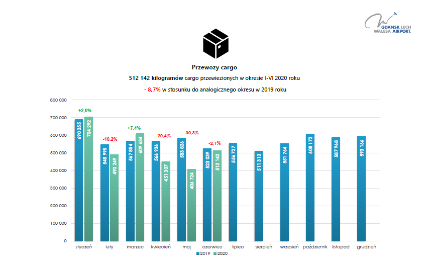 W pierwszym półroczu 2020 najmniejszy spadek, o 8,7%, gdańskie lotnisko zanotowało w obsłudze cargo, czyli transporcie towarów i poczty. W czasie epidemii koronawirusa samoloty cargo mogły latać bez ograniczeń. Ruch był jednak mniejszy niż przed epidemią, bo nie było możliwości odprawiania przesyłek na samoloty rejsowe i nie działała duża liczba firm.