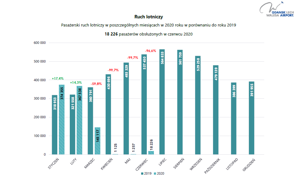 - czerwiec 18 226 pasażerów, spadek o 96,6% w porównaniu do czerwca 2019