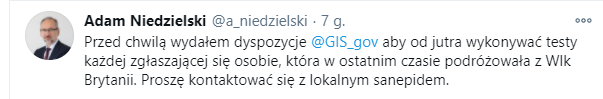 Osoby, które przyjeżdżają z Wielkiej Brytanii mają być testowane na obecność koronawiruusa. Zapowiedział to na Twitterze minister zdrowia Adam Niedzielski.