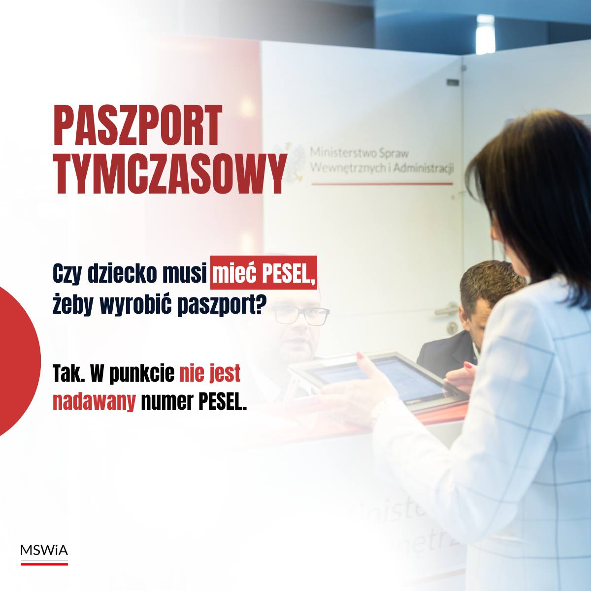Dzieci muszą mieć numer Pesel, by można im było wyrobić paszport tymczasowy. W przypadku ich podróży, w biurze musi być dwoje rodziców, którzy wyrażą zgodę na wyrobienie paszportu tymczasowego.