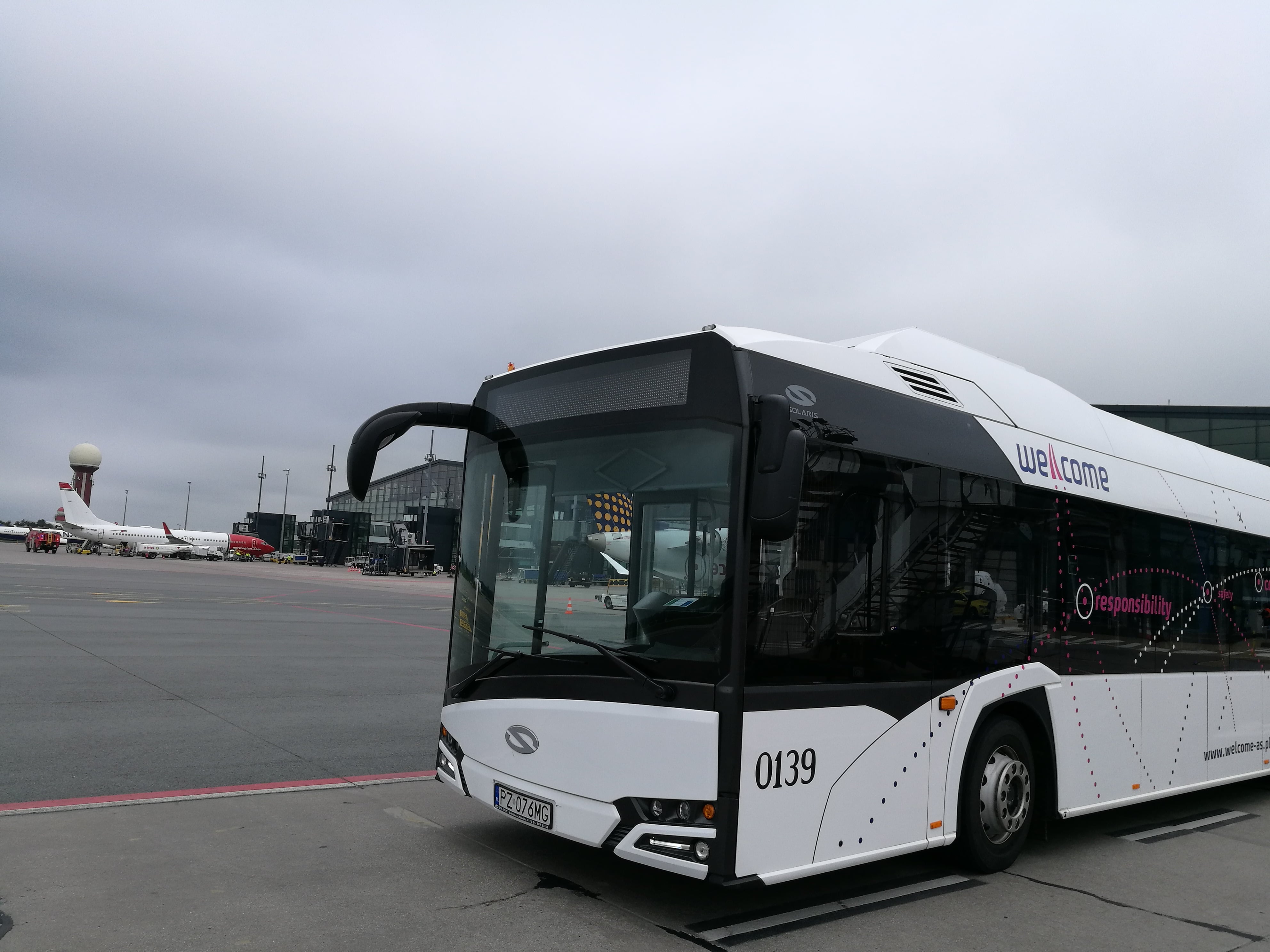 Niskopodłogowy autobus Urbino 12 wożący pasażerów po płycie lotniska jest wygodny, cichy i nie emituje spalin. Pojazd ma litowo- jonowe baterie, które ładowane są w bazie firmy Welcome na gdańskim lotnisku. Na jednym ładowaniu autobus może jeździć cały dzień.