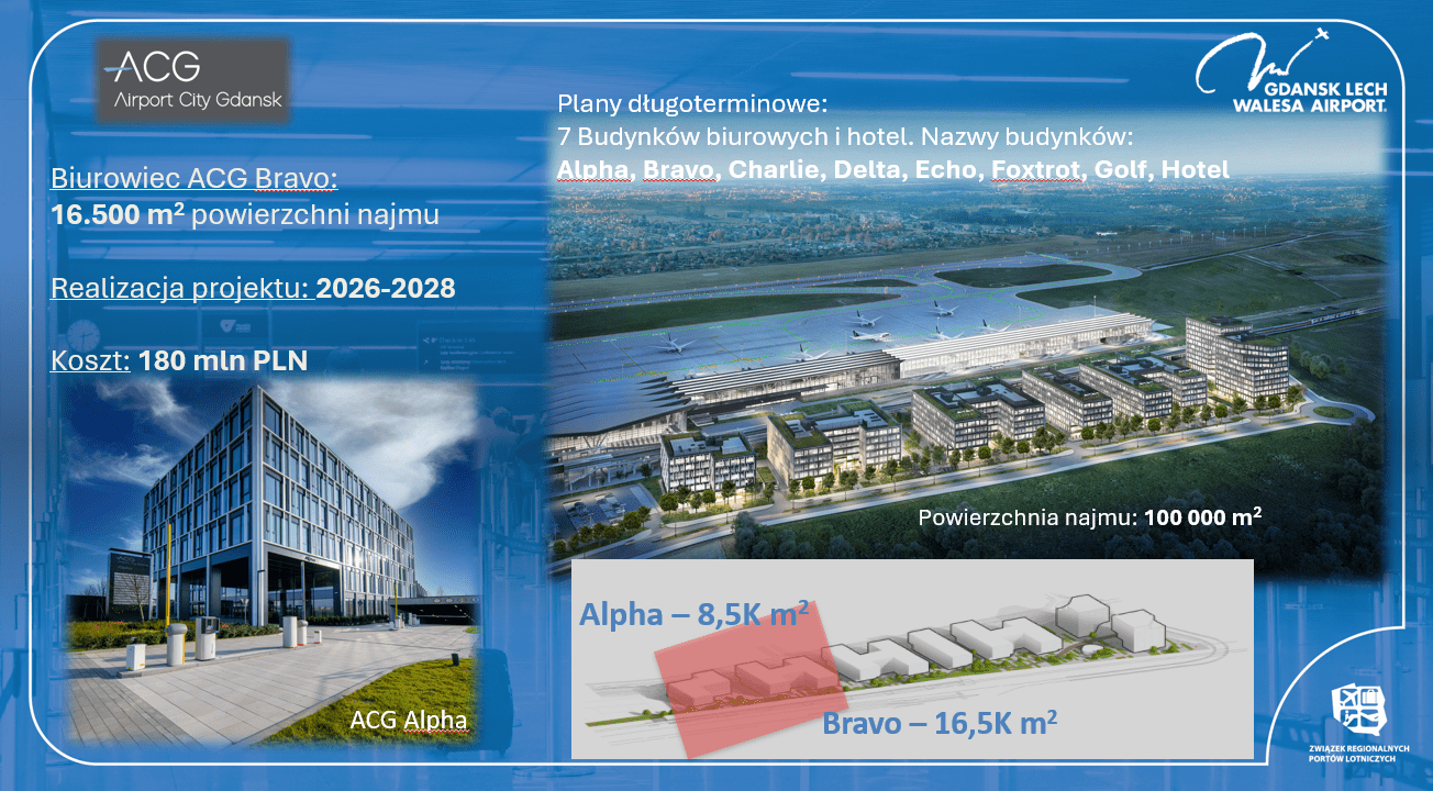Lotnisko chce kontynuować budowę kompleksu Airport City Gdańsk. Po skomercjalizowaniu pierwszego biurowca o nazwie Alpha z 8,5 tys. metrów kwadratowych powierzchni najmu (obecny poziom komercjalizacji to 90%), firma będzie budować kolejny z zaplanowanych budynków. Biurowiec Bravo będzie 2 razy większy od pierwszego Alphy i będzie miał 16,5 tysiąca metrów kwadratowych powierzchni najmu, zostanie wybudowany do 2028 roku za 180 milionów złotych. W dalekosiężnych planach jest w sumie 7 biurowców i hotel.