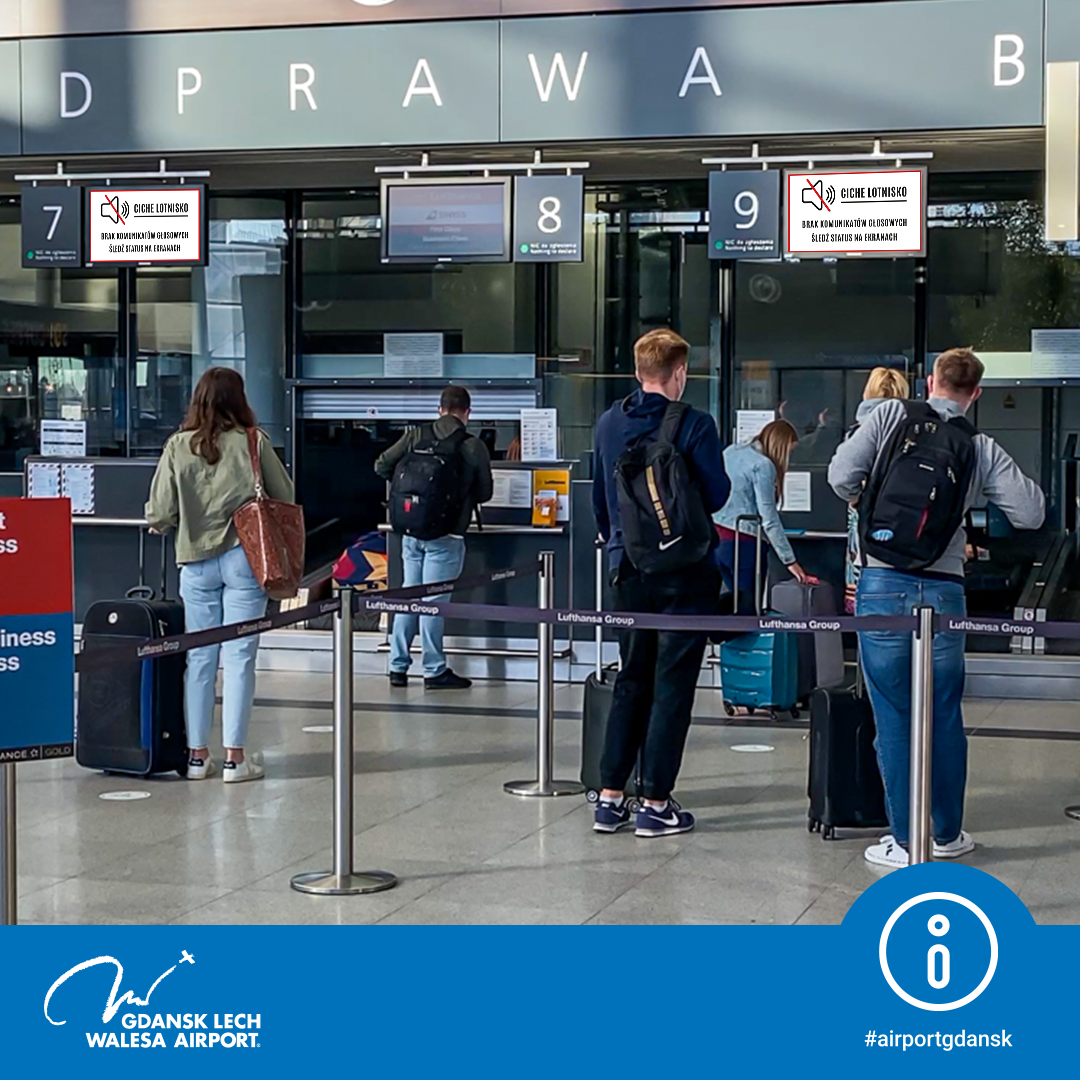 Port Lotniczy Gdańsk zachęca pasażerów do zwracania uwagi na informacje wyświetlane na monitorach dostępnych wzdłuż całej drogi, od stanowisk kontroli bezpieczeństwa aż do gate’ów i zwracania bacznej uwagi na godzinę zakończenia boardingu. Pasażerowie korzystający z oferty gastronomicznej i zakupowej, we własnym zakresie i na własną odpowiedzialność muszą kontrolować status odprawy prezentowany na monitorach.