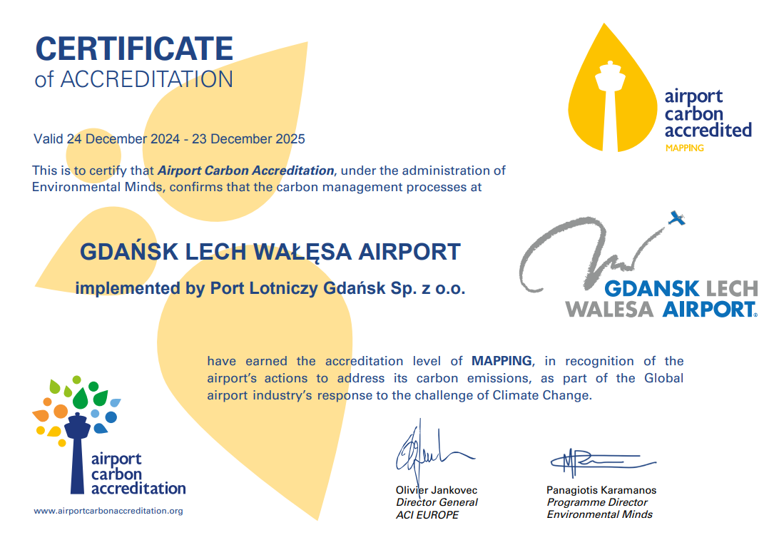 Gdańskie lotnisko otrzymało certyfikat ACA na poziomie pierwszym, tzw. Mapping. Program składa się w sumie z siedmiu poziomów, z których każdy następny nakłada na porty kolejne zadania do zrealizowania.