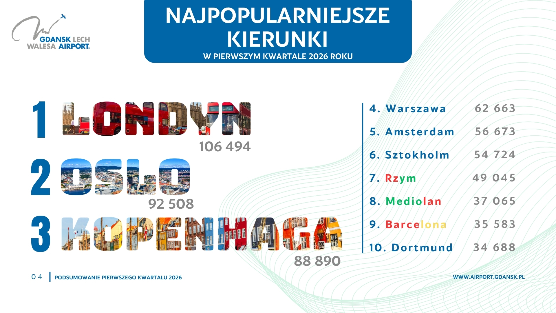Najpopularniejsze kierunki, jakie wybierali nasi pasażerowie w pierwszym kwartale tego roku to: Londyn (106 494) i Oslo (92 508), a na trzecim miejscu Kopenhaga (88 890).