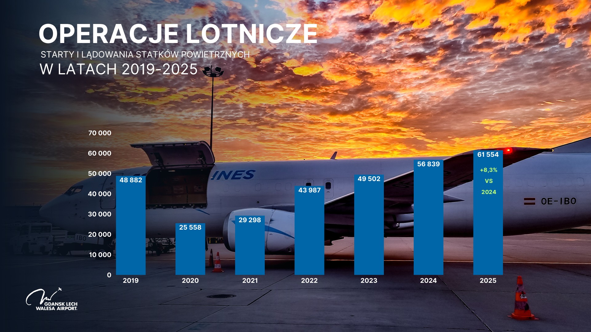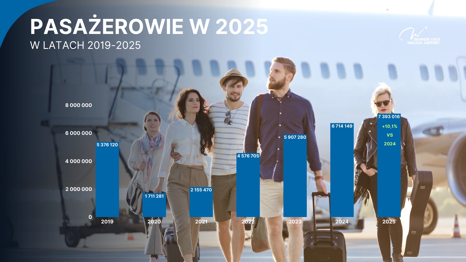 W minionym roku z gdańskiego lotniska skorzystało prawie 7,4 mln pasażerów, co oznacza wzrost o ponad 10 proc. w porównaniu z rokiem 2024. Dokładnie w 2025 roku Port Lotniczy Gdańsk obsłużył 7 393 016 pasażerów. W tym samym czasie wykonano 61 554 operacji lotniczych, czyli startów i lądowań, co stanowi wzrost o 8,3 proc. rok do roku.