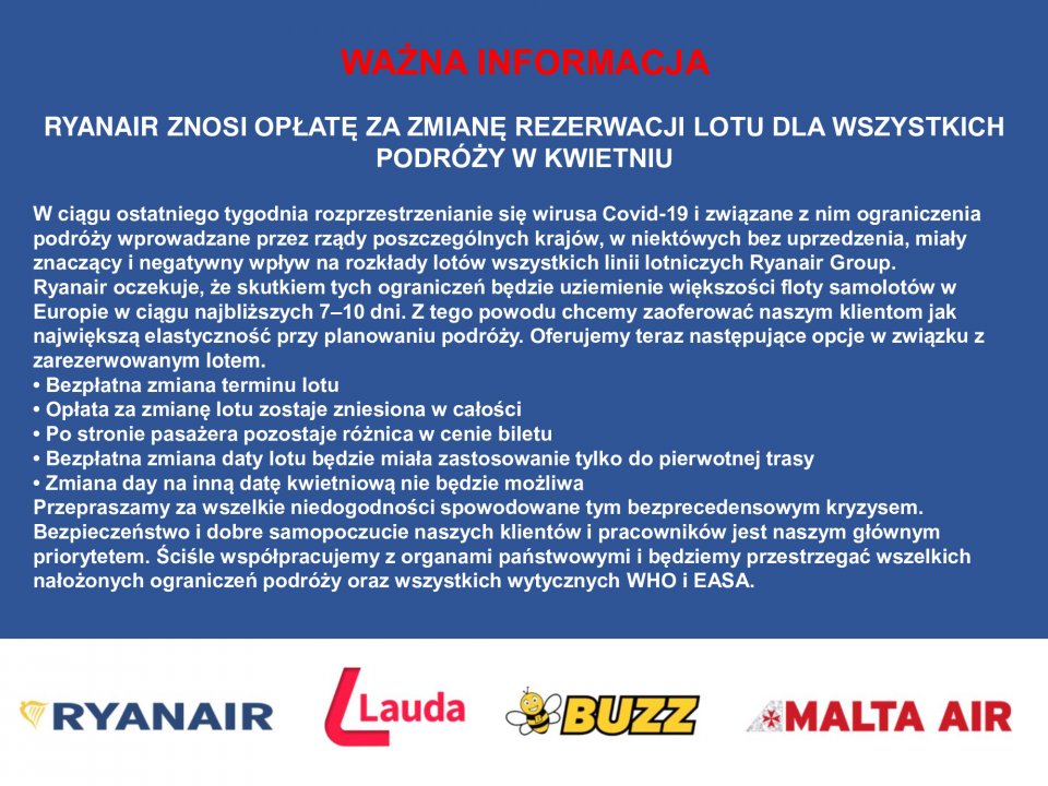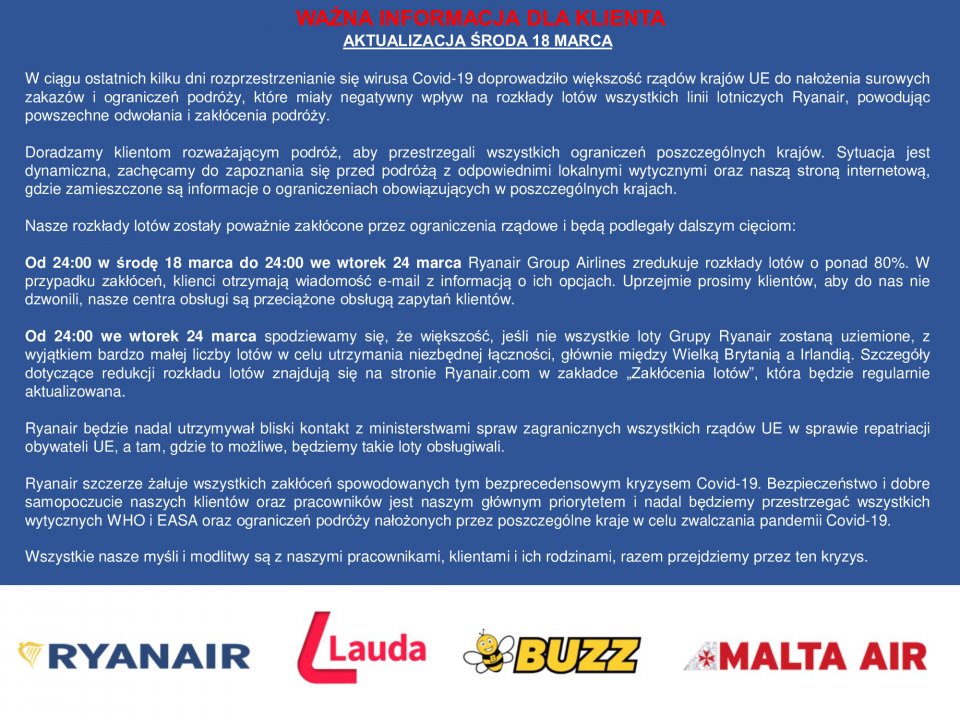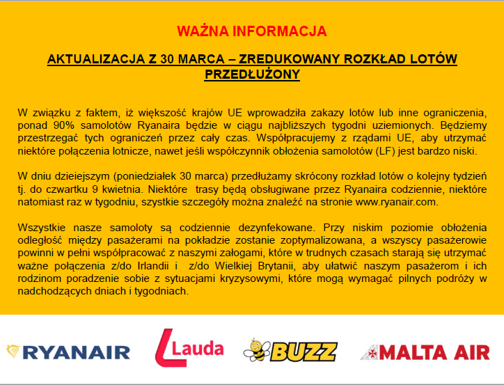 W odpowiedzi na decyzję polskiego rządu o zakazie ruchu lotniczego w całym kraju w celu powstrzymania rozprzestrzeniania się wirusa Covid-19, Grupa Ryanair (w tym Buzz i Lauda) została zmuszona do odwołania wszystkich lotów z/do Polski,od godziny 24:00 w sobotę 14 marca do wtorku 31 marca. Kontaktujemy się ze wszystkimi klientami, których loty anulowano drogą e-mailową, aby poinformować ich o wszystkich opcjach i zachęcamy klientów, aby do nas nie dzwonili. Jest to szybko zmieniająca się i złożona sytuacja, a bezpieczeństwo i dobre samopoczucie naszych pracowników i klientów jest naszym głównym priorytetem. Będziemy nadal w pełni przestrzegać wszystkich wytycznych WHO i EASA, a także dostosujemy się do wszelkich nałożonych ograniczeń podróży.