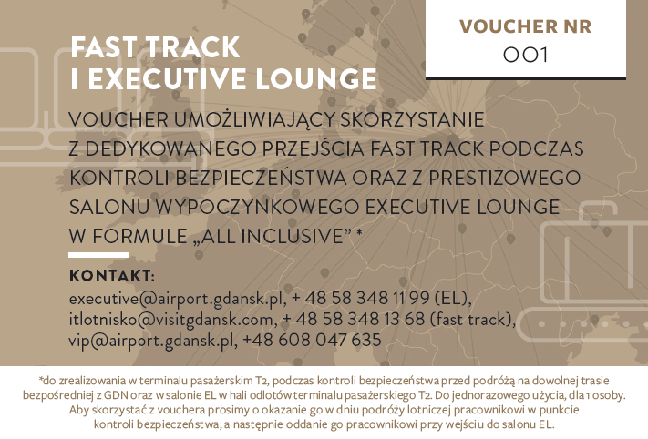 W siatce połączeń lotniczych z Portu Lotniczego Gdańsk jest ponad 70 kierunków do prawie 20 krajów. Zachęcamy do latania i mamy dla naszych pasażerów specjalną ofertę zakupu voucherów umożliwiających skorzystanie z salonu Executive oraz szybkiego przejścia przez kontrolę bezpieczeństwa Fast Track. W ofercie jest też usługa Executive Lounge + Fast Track.