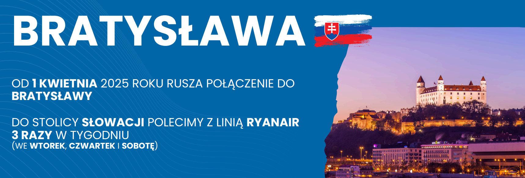 Po sukcesie połączenia z Gdańska do czeskiej Pragi, irlandzka linia lotnicza zdecydowała o uruchomieniu nowych połączeń do stolicy Słowacji. Już od 1 kwietnia 2025 roku polecicie do Bratysławy trzy razy w tygodniu, we wtorki, czwartki i soboty. To jedyne połączenie do stolicy Słowacji z Polski.
