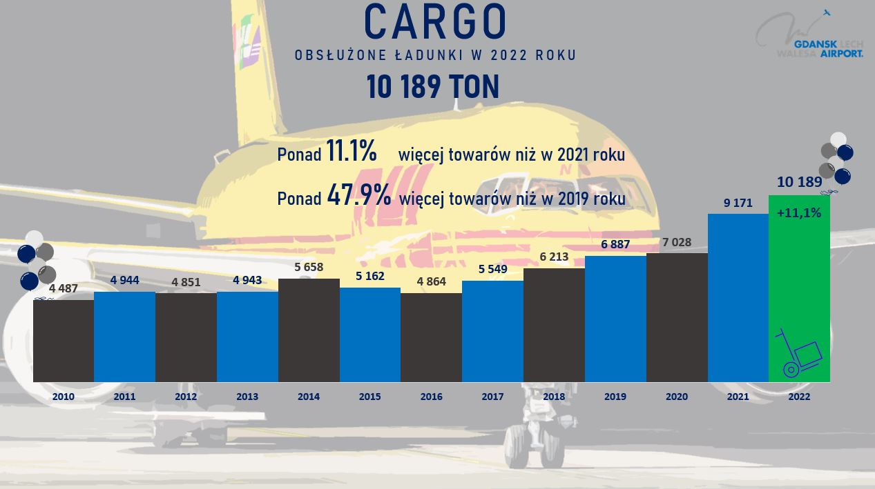 Port Lotniczy Gdańsk ma za 2022 rok rekordowy wynik w ilości obsłużonych towarów. W ciągu 12 miesięcy było to w sumie 10 189 ton cargo, o 11,1% więcej niż w 2021 roku. Od 2019 roku zanotowaliśmy już wzrost o 47,9%.