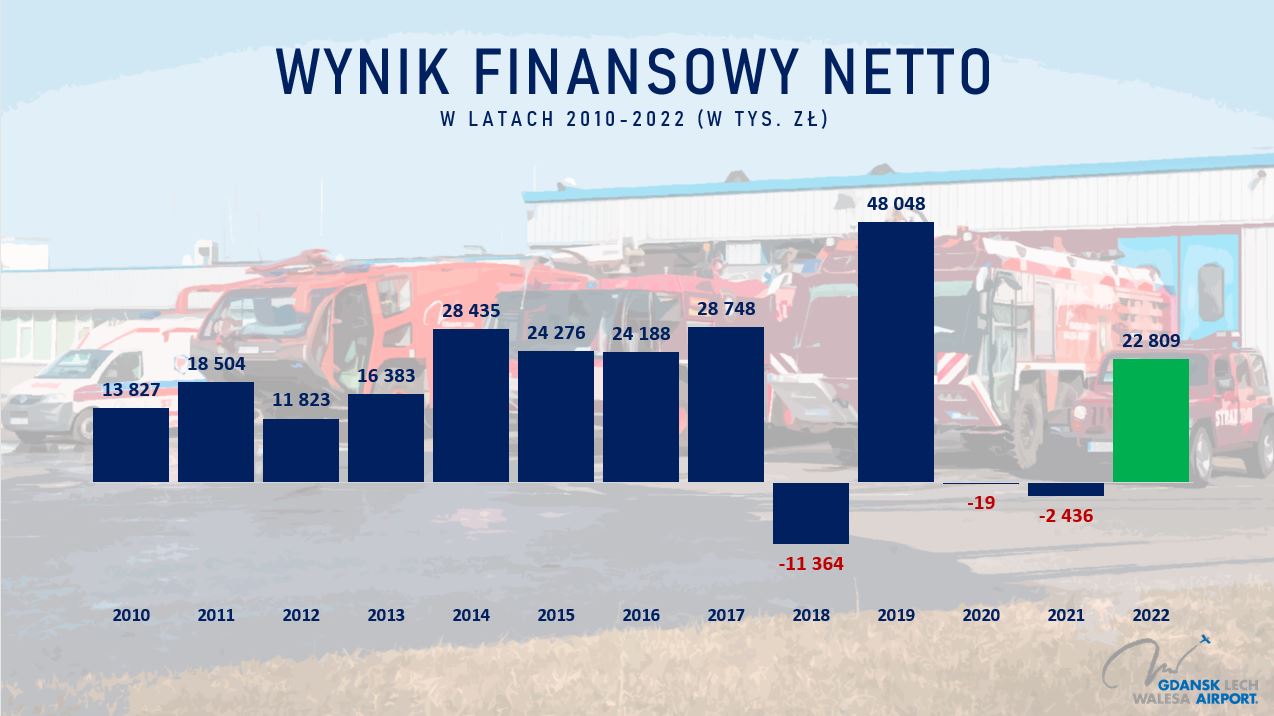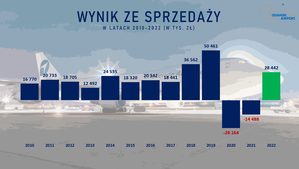 Port Lotniczy Gdańsk w 2022 wypracował prawie 23 miliony złotych zysku netto (22 809 tys. zł). To duży skok w porównaniu do 2021 roku, kiedy mieliśmy -2,4 mln zł straty (-2 436 tys. zł). W 2022 roku Port zanotował prawie 28,5 mln zł zysku ze sprzedaży (28 442 tys. zł), dla porównania w 2021 roku była starta prawie -14,5 mln zł (-14 488 tys. zł).