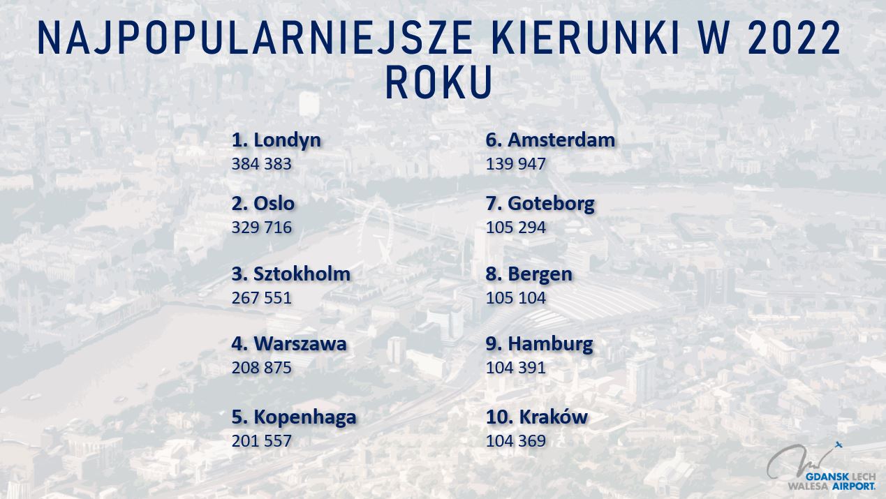 W 2022 roku najczęściej wybierane przez pasażerów kierunki lotów z Gdańska to: Londyn (384 383), Oslo (329 716) i Sztokholm (267 551).
