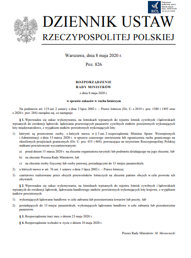 Rozporządzenie Ministra Infrastruktury w sprawie zakazu lotów ma obowiązywać do 9 maja 2020. Dokument wprowadza zakaz lądowania na polskich lotniskach samolotów cywilnych przewożących pasażerów, wykonujących loty międzynarodowe oraz krajowe. Wyjątkiem są m.in. rejsy realizowane na zlecenie premiera, loty w ramach akcji powrotu Polaków do kraju, a także czarterowe realizowane przez obcych przewoźników lotniczych na zlecenie państw obcych w celu powrotu ich obywateli. Zakaz nie dotyczy nadal przewozu towarów i poczty.