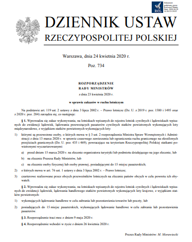 Jest nowe rozporządzenie Rady Ministrów w sprawie zakazu lotów. Formalnie wejdzie w życie 10 maja. Przepisy zabraniają do 23 maja br. wykonywania, na lotniskach wpisanych do rejestru lotnisk cywilnych i lądowiskach wpisanych do ewidencji lądowisk, lądowania przewożących pasażerów cywilnych statków powietrznych wykonujących loty międzynarodowe i krajowe. Oznacza to, że na terenie kraju przez kolejne dwa tygodnie nie będą mogły być wykonywane żadne regularne rejsy komercyjne. Zakazy nie obejmują lotów towarowych i przewożących pocztę, a także operacji General Aviation samolotami dysponującymi do 15 miejsc pasażerskich.