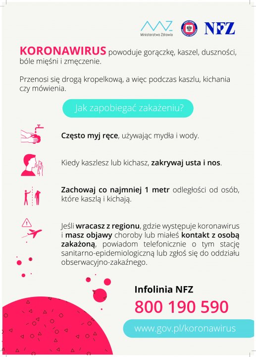 W ostatnich kilku tygodniach w krajach europejskich i na całym świecie (aktualna lista krajów dostępna na stronach: www.who.int, www.ecdc.europa.eu, www.gis.gov.pl), wystąpiły zachorowania z objawami: gorączki, kaszlu, duszności i problemów z oddychaniem. Jeśli byłeś w tych krajach w ciągu ostatnich 14 dni, w przypadku zaobserwowania u siebie ww. objawów bezzwłocznie, telefonicznie powiadom stację sanitarno-epidemiologiczną lub zgłoś się do oddziału zakaźnego, gdzie określony zostanie dalszy tryb postępowania medycznego.