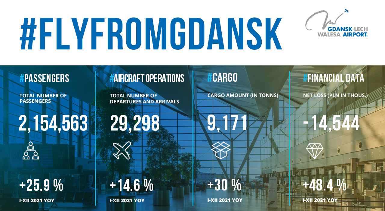 Im Jahr 2021 wurden am Flughafen Danzig 25 % mehr Reisende abgefertigt als im Jahr zuvor. Der Frachtverkehr ist um 30 % gestiegen. Langsam bewegen wir uns nach oben!