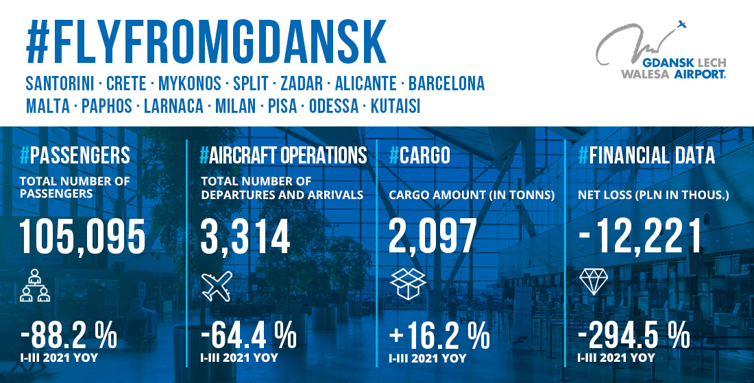 During the three months of 2021, there were 105,095 travelers at Gdansk Airport (88.2% drop compared to the first quarter of 2020) and 3.314 air operations (64.4% drop). The amount of the handled goods and mail increased by over 16%.